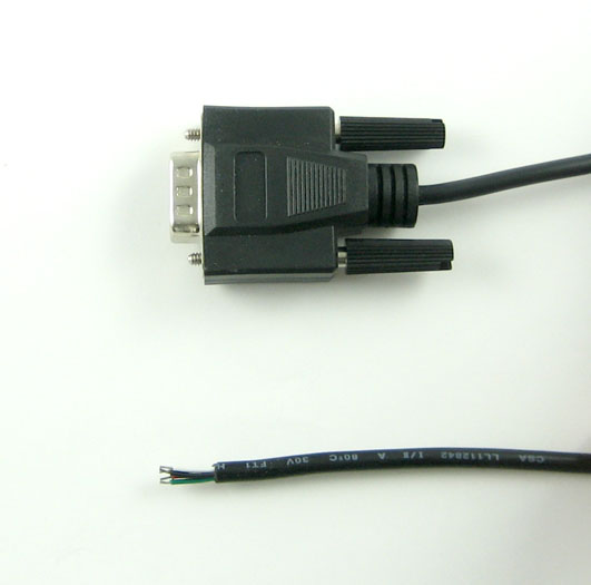 We had these cables custom made for some future projects. They're 1 meter long, with a male DE9 (DB9) connector on one end and five stripped and tinned wires on the other end. The outer jacket is stripped to 10mm, and the individual conductors are stripped and tinned to 2 +/- 0.5mm. Outer jacket diameter is 4mm. The cable is wired as follows: