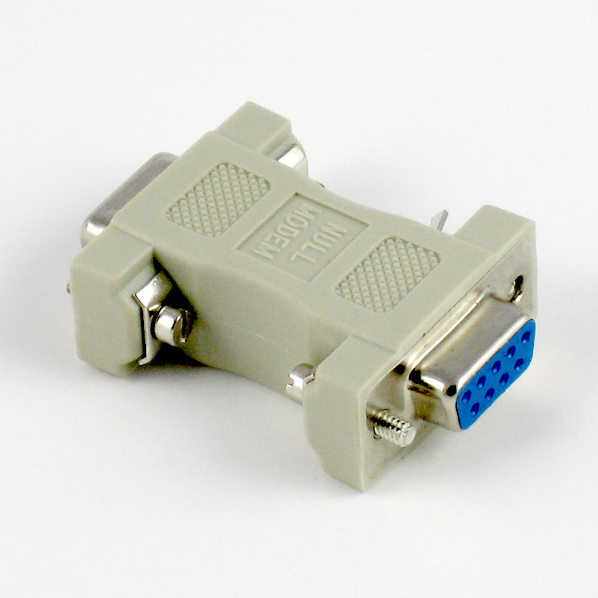 Null modem adapter with 9-pin female connectors on each end. Useful for converting a regular serial cable or USB adapter to a null modem cable.