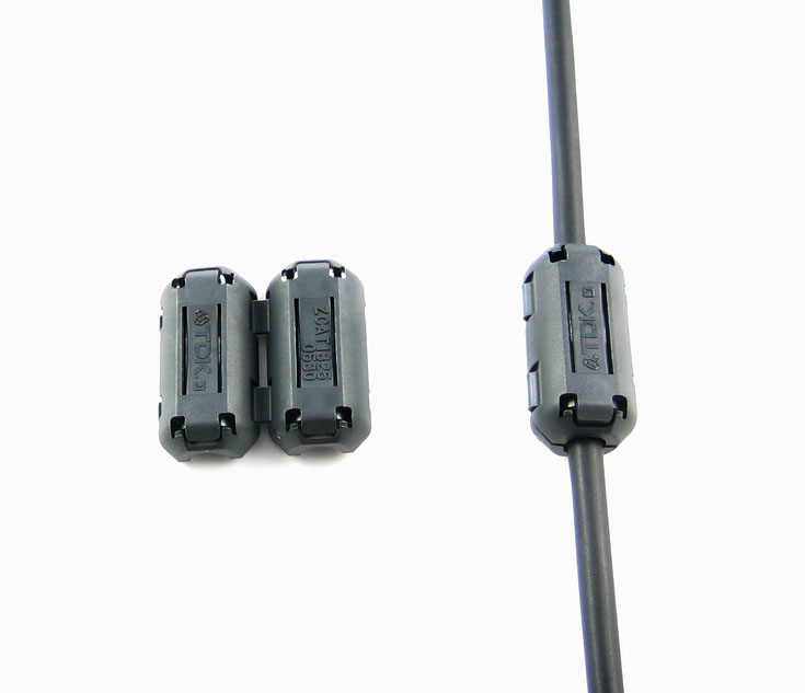 Clamp-on ferrite RFI filter for cables 3 to 5 mm in diameter. These filters fit perfectly on our speaker mic cables and TH-D7 cables, as well as the data cables for the Deluo and Garmin GPS 18 receivers.